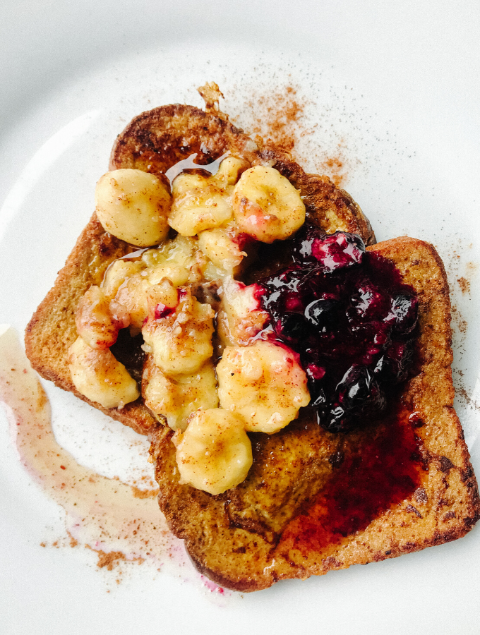 - Serve the French Toast warm with caramelized bananas, berry jam, and a light drizzle of maple syrup!